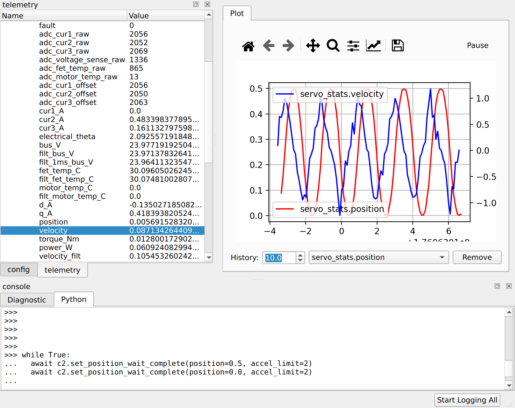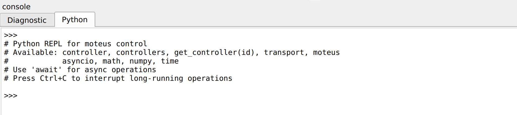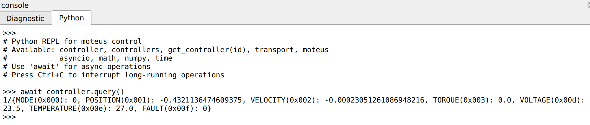 The bottom console now has two tabs, the first and default remains the diagnostic console, where you can see what diagnostic messages the devices are emitting and send diagnostic channel commands directly to connected devices. The new, second tab, is labeled “Python” and provides access to a fully functional Python evaluation environment with full access to the moteus python library, including asynchronous operations.