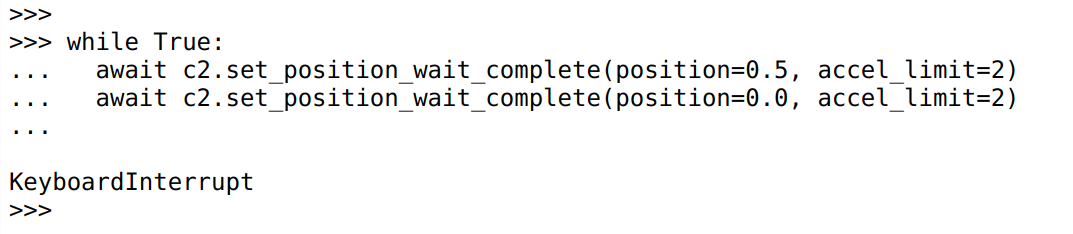 Which will communicate with the controller with CAN ID 4. The argument to get_controller can be a CAN-ID, a UUID, a moteus.DeviceAddress, or any string that would be usable as a prefix in the diagnostic console.