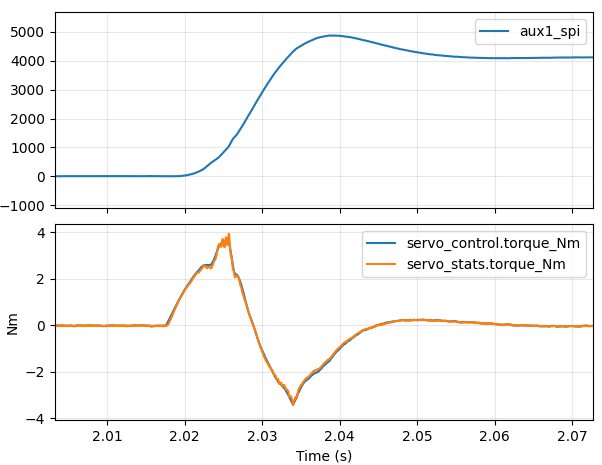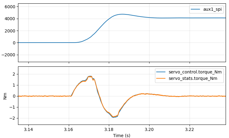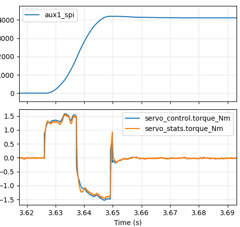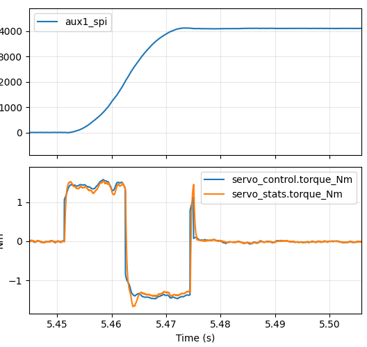 Better at around 37ms, but still not great. In our ideal world, we would command maximum positive torque right until roughly the halfway point, at which point we would command maximum negative torque. The first approach I decided to take was to add an “inertial feedforward” term into moteus. When executing an acceleration limited trajectory, the “control acceleration” is multiplied by an estimate of the total system’s moment of inertia to produce a feedforward torque at each time step. Since moteus implements a constant acceleration planner, that will result in a fixed positive torque until the halfway point, then a fixed negative torque until the final stopped point. That is unlikely to be optimal, as power or speed limits may mean that the achievable torque differs at different speeds, but it is at least a start.